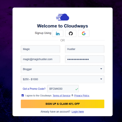 - Thirdly you must enter all your information when creating a Cloudways account. Don`t forget "Got A Promo Code?"field.